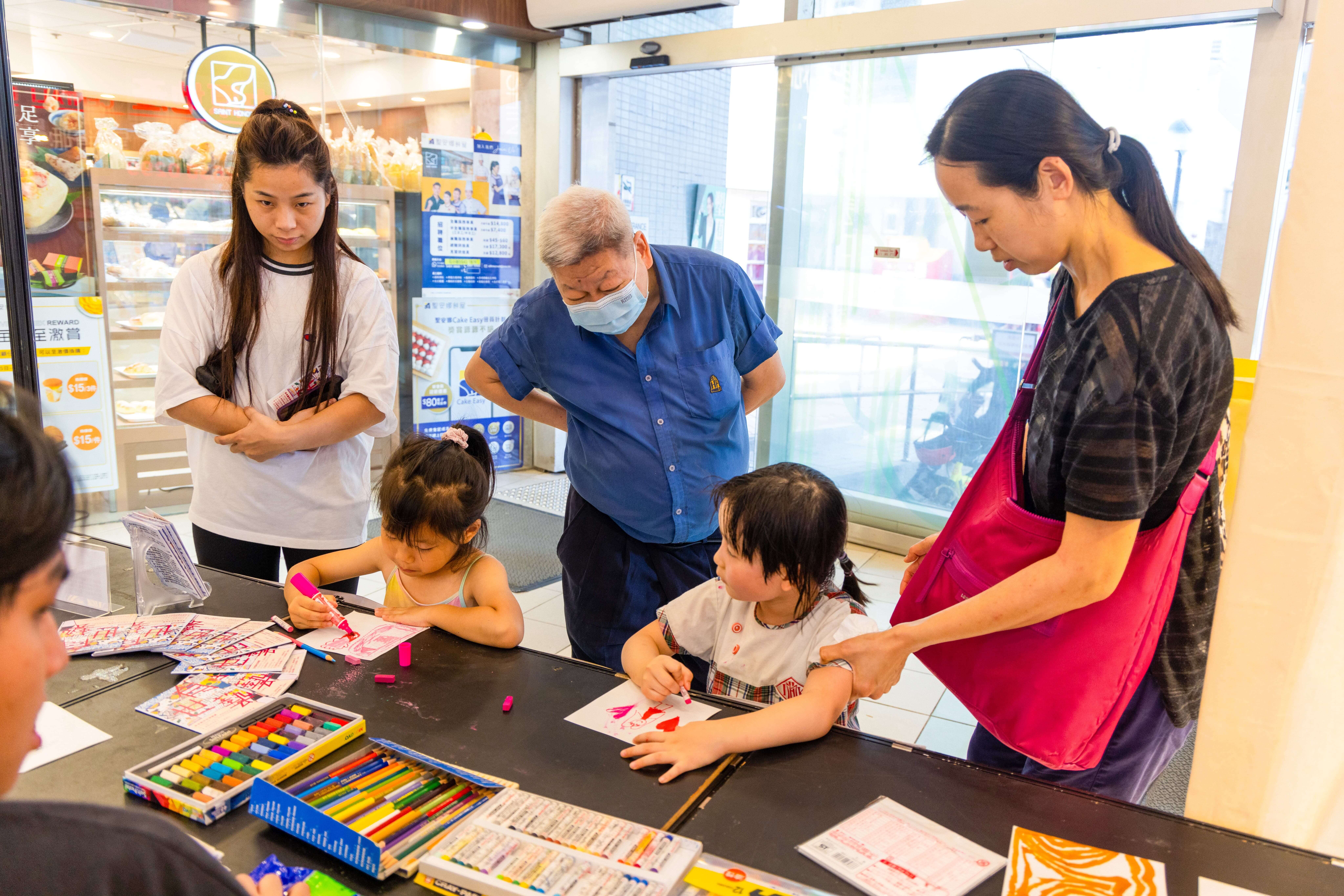 藝術家維怡和Lorin在中心大堂和長者試玩,以一種顏色演譯多種質感,放膽落筆,長者在畫紙上漸漸找到新發現